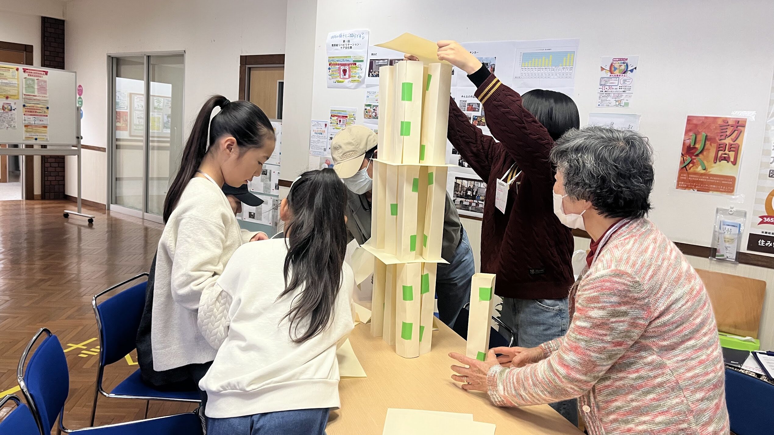 ペーパータワー作り、モルック、自己紹介ゲームなど