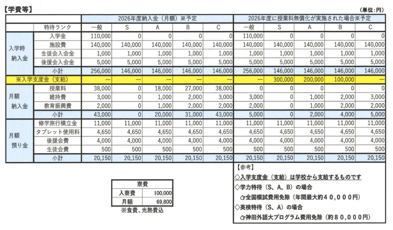 S特待生の場合、入学時の入学金や施設費が無料になるだけでなく、授業料や維持費などの月額納入金も無料となります。